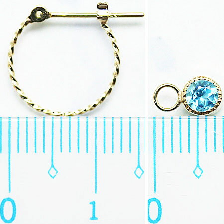 着け外しのできる、4mmの天然カラーストーンのチャームが付いた らせん模様のある、14金ワッカピアスです 使用宝石 ブルートパーズ:ラウンドカット:直径-約4mm 使用地金 14金イエローゴールド(K14の刻印有) サイズ *全体:縦-約20mm:横-約4.8mm *チャーム部分:縦-約8mm:横-約4.8mm ピアスに通すマル輪部分の内径-約2.2mm チャームの付け外しは出来ます 1:正面-幅:約0.78mm 2:正面-縦:約13.5mm 3:横-直径:約13mm 4:内径-縦:約11mm 5:ポスト径:約0.7mm 6:ポスト幅:約5.3mm 重量:約0.75グラム 両耳用1セット(2個入り)での販売となります。