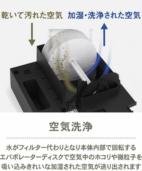 ■空気清浄 水がフィルター代わりとなり、本体内部で回転する広い表面積を持ったエバポレーターディスクで空気中の埃や微粒子を吸い込みキャッチし、綺麗な加湿された空気が送りだされます。
