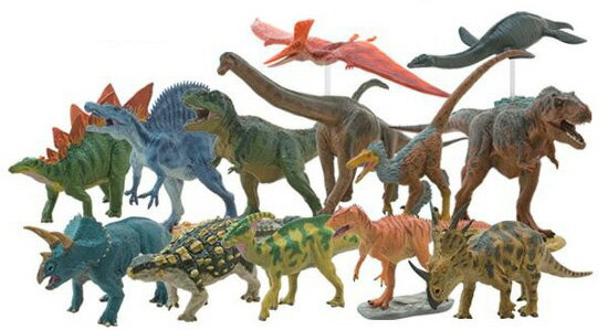 ダイナソーソフトモデルセットCの恐竜たち ティラノサウルス、羽毛ティラノサウルス、トリケラトプス、ブラキオサウルス、ステゴサウルス、アロサウルス、スティラコサウルス、スピノサウルス、パラサウロロフス、ヴェロキラプトル、アンキロサウルス、プテラノドン、プレシオサウルス の13体です。