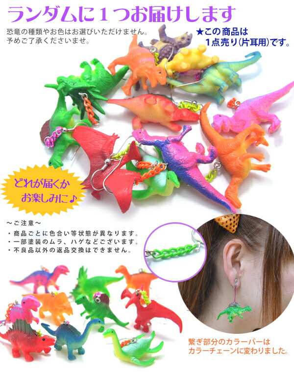 ポップな片耳用ピアス サイズ チェーンの長さ:約20mm恐竜の大きさ:約50mm〜70mm×20mm〜40mm 注意 ・お客様側で恐竜の種類やお色はお選び頂けません。